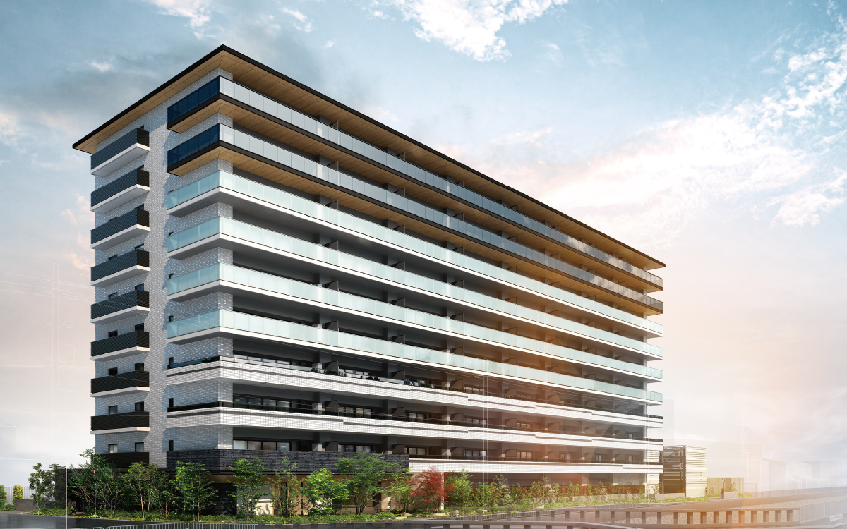 外観完成予想図過去に遡ること平安時代。紙漉きにより薄墨が流れたというエピソードが残る天神川。地域に親しまれる清流は現代に変わることなく受け継がれ、未来へと続いていきます。その様をガラス手摺やタイル貼、スラブラインなどの多様な素材を用いて建築デザインに落とし込みました。