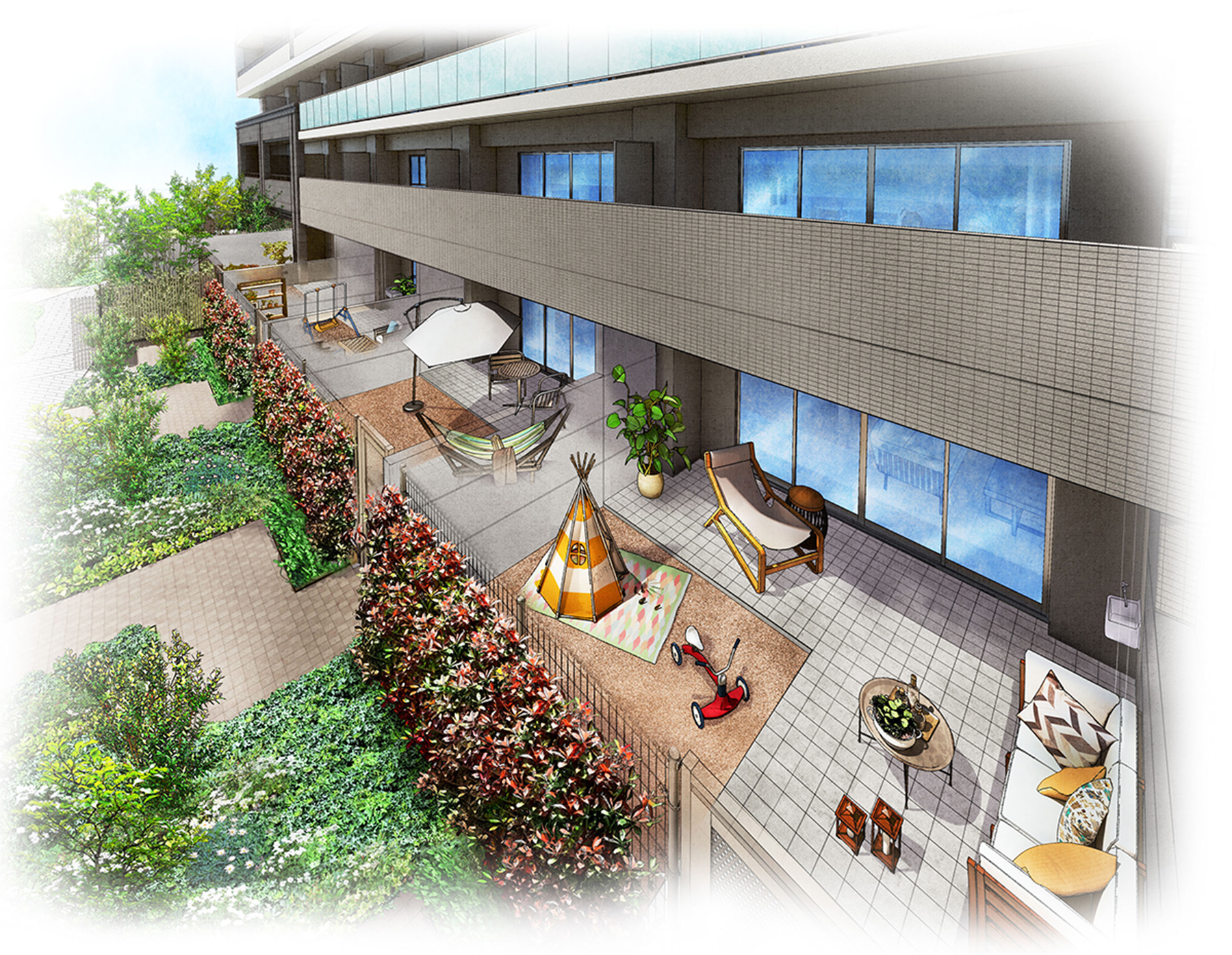 ※掲載の1階テラス&専用庭イメージイラストは、図面を基に描き起こしたものであり、形状・色味等は実際とは異なります。
